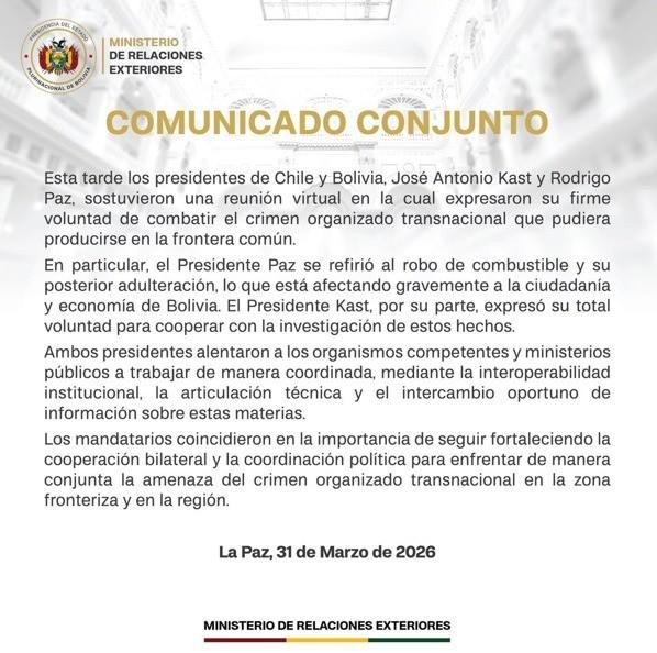 En un comunicado oficial del Ministerio de Relaciones Exteriores, se detalla que esta tarde -31 de marzo-, los presidentes de Chile y Bolivia expresaron su firme voluntad de combatir el crimen organizado transnacional que pudiera producirse en la frontera común. Y Kast expresó su total voluntad para cooperar con la investigación de estos hechos.