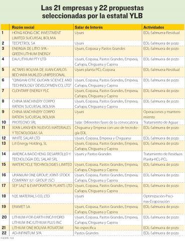 Una semana y media después, YLB hizo conocer la nómina de 26 empresas que quedaron habilitadas para la Fase II para el desarrollo del litio y otros recursos evaporíticos en siete salares.
